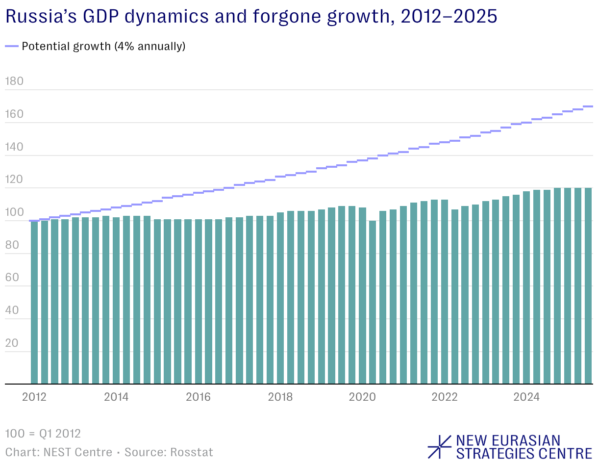 On the other hand, the 2025 growth slowdown appears historically consistent. Since Vladimir Putin returned to the presidency in 2012, Russia’s average annual economic growth rate has stood at 1.37 per cent. The gap relative to early-2010s estimates of potential growth (around 4 per cent per year) has widened steadily over the past 13.5 years.